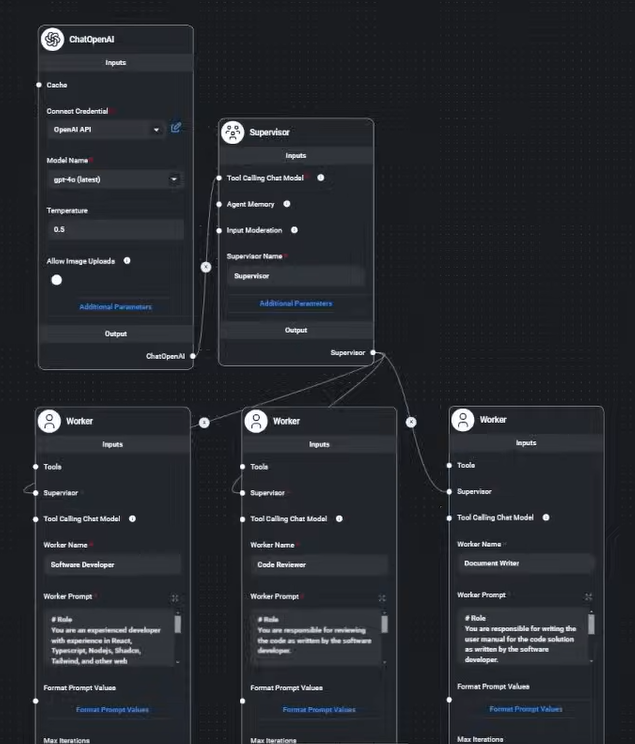 Med Flowise Agentflows, kan du feks byggen en Multi Agent softwareudviklingsteam, der indeholder tre arbejderagenter en softwareudvikler en kode anmelder og en dokumentskribent